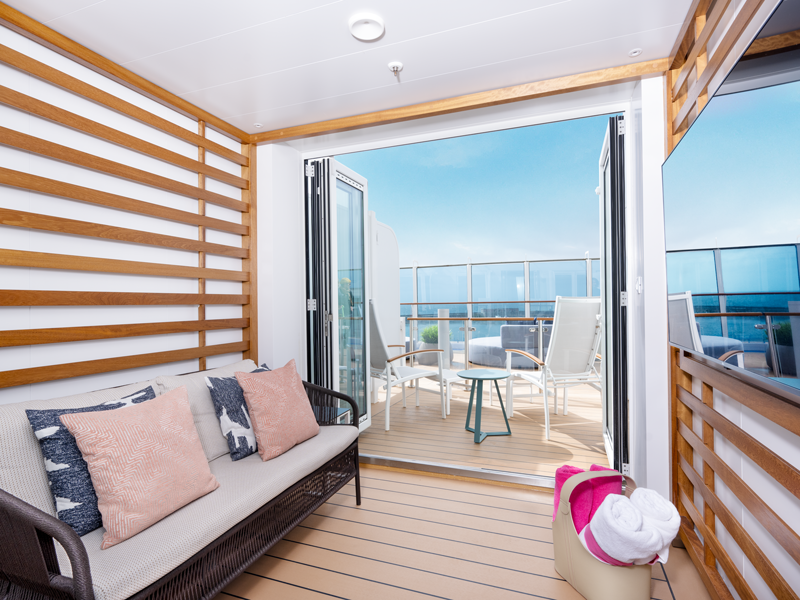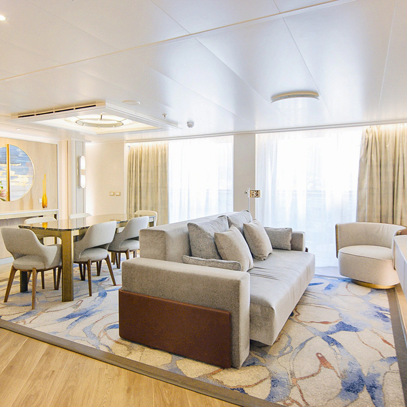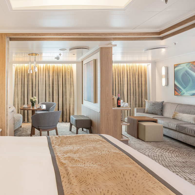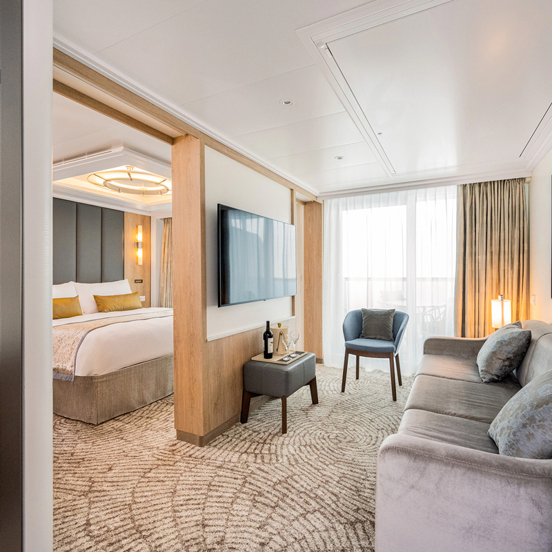 Experience ultimate luxury in one of the largest suites on board, featuring two bedrooms, two bathrooms, and an oversized balcony.